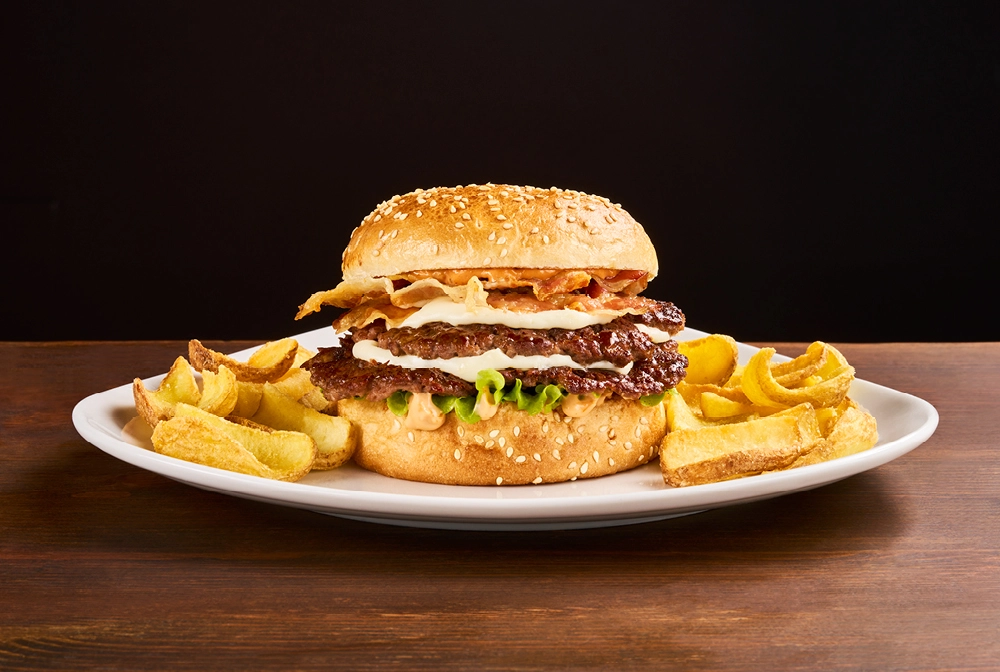 Panino con semi di sesamo*, doppio hamburger* di carne italiana, salsa al "Pecorino Romano DOP", guanciale nostrano, insalata iceberg, salsa maionese senapata con pomodori secchi, servito con patate* Premium Fries e salsa OWW